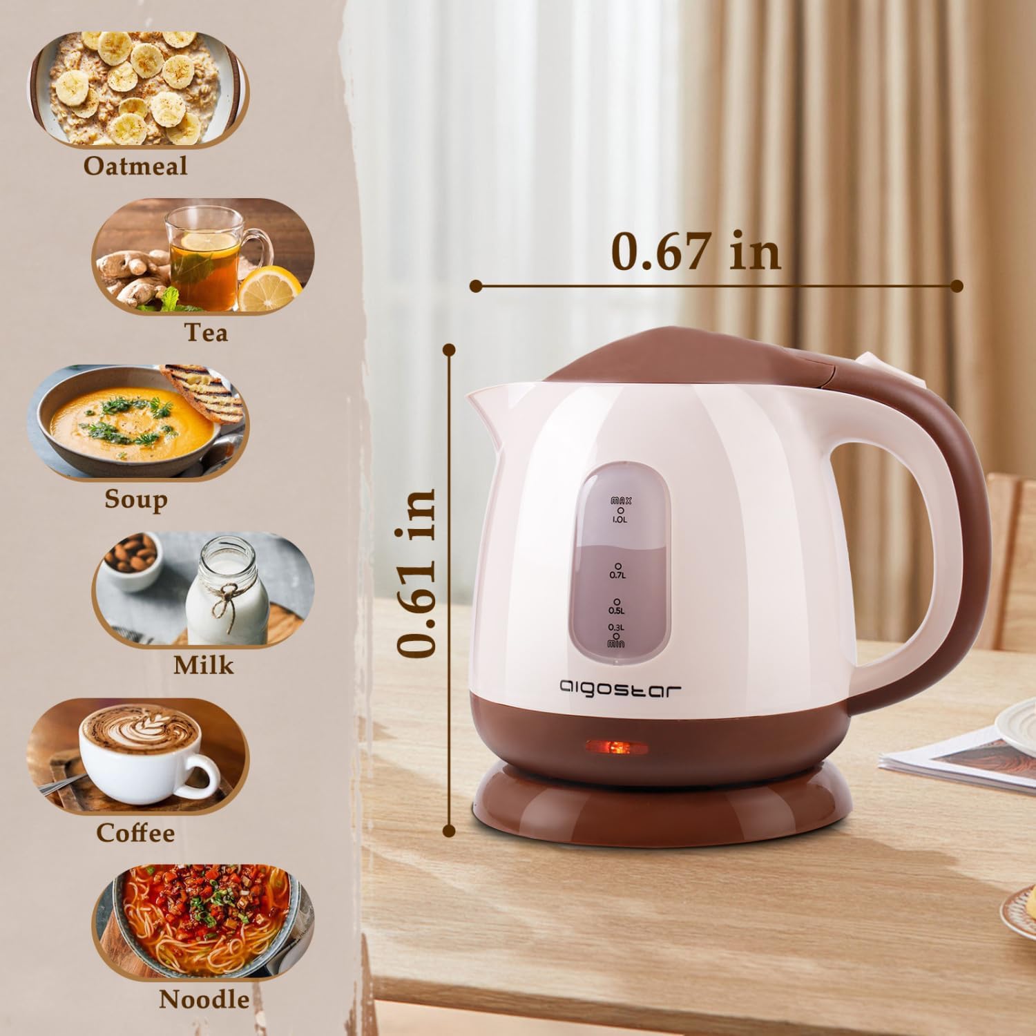 Aigostar Small Electric Kettle, 1L Portable Electric Tea Kettle 1100W with Automatic Shut-Off and Boil Dry Protection, Travel Hot Water Boiler Cordless for Making Coffee and Tea, BPA-Free, Brown