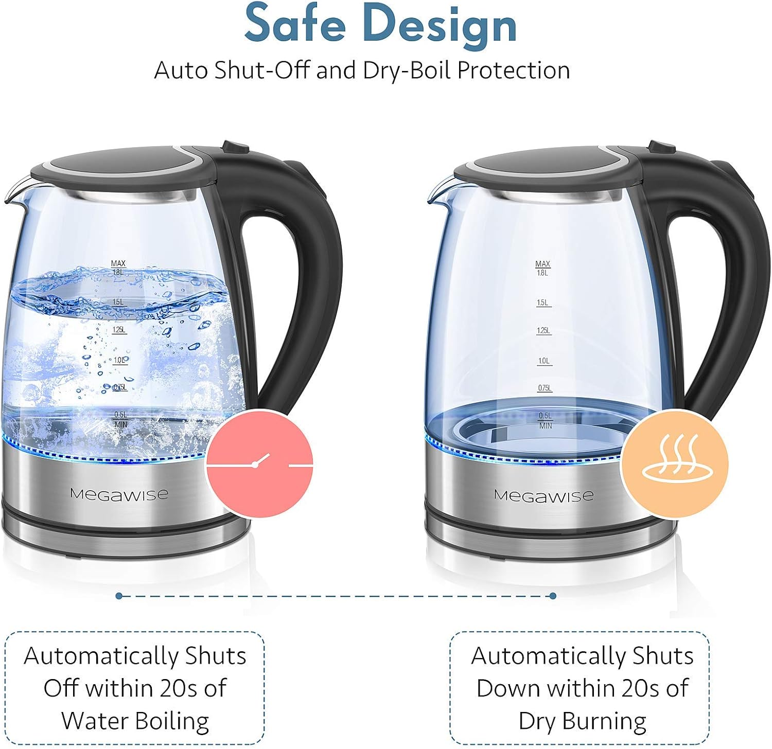 - 【Hazard free & Auto-Shut-Off—Healthier & Safer Kettle】: The kettle features quality borosilicate glass with low thermal expansion coefficients, making it more resistant to thermal shock. The kettle’s inner base and lid are made of 304 stainless steel—no plastics touch the boiling water inside, making your water remain healthy. The kettle automatically shuts off within 20 seconds of boiling, it eliminates dry burning and features double protection, making this product safer than stovetop kettles.