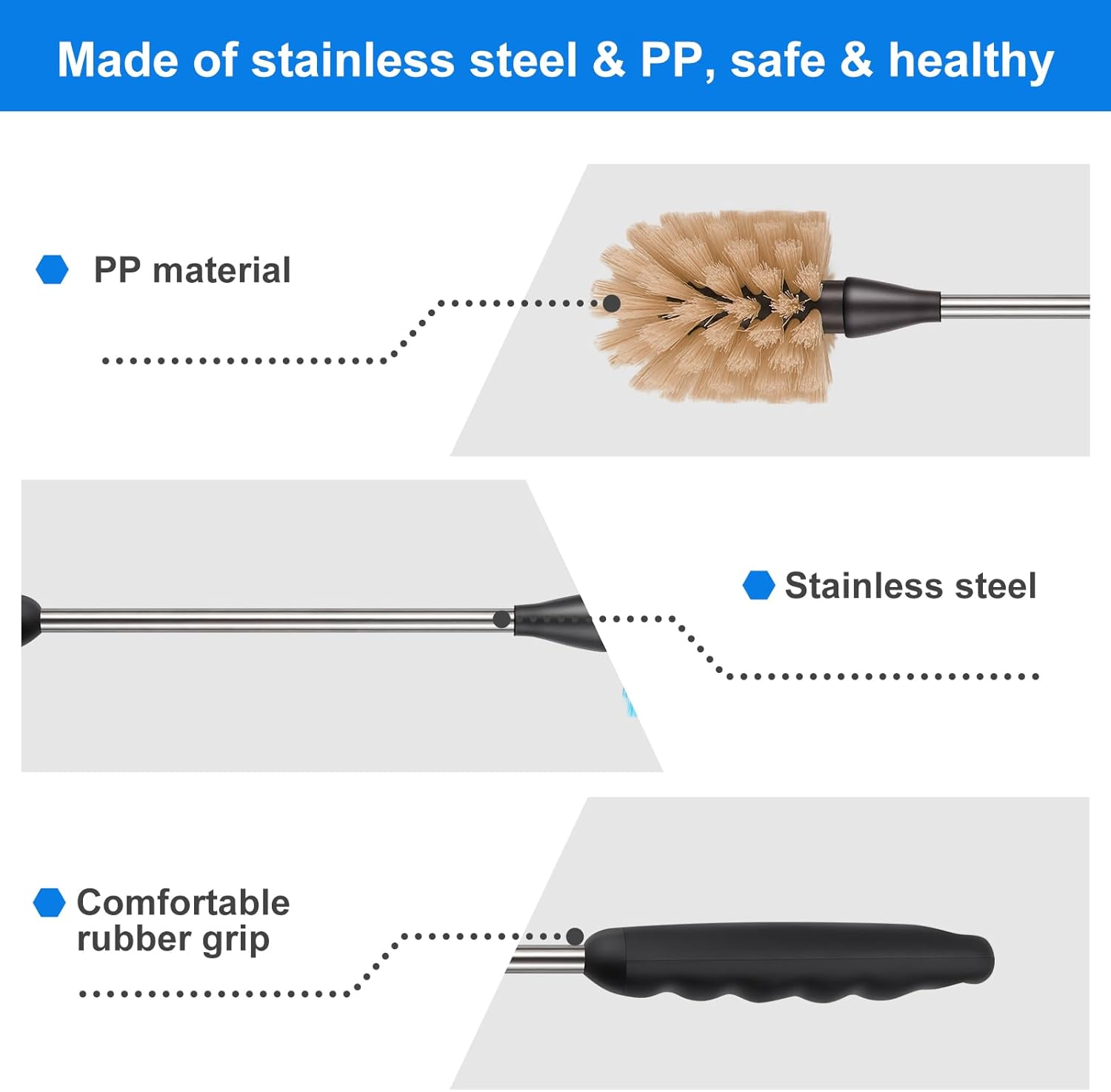 - Premium Brush Set - Features scratch-resistant, odor-free nylon bristles. The flexible stainless steel handle with ergonomic grip design enables easy control of the long-handled brush head to reach every corner inside bottles. It effectively removes stubborn stains at the bottom and in hard-to-reach corners, while the blue bristles efficiently clean the bottle body.