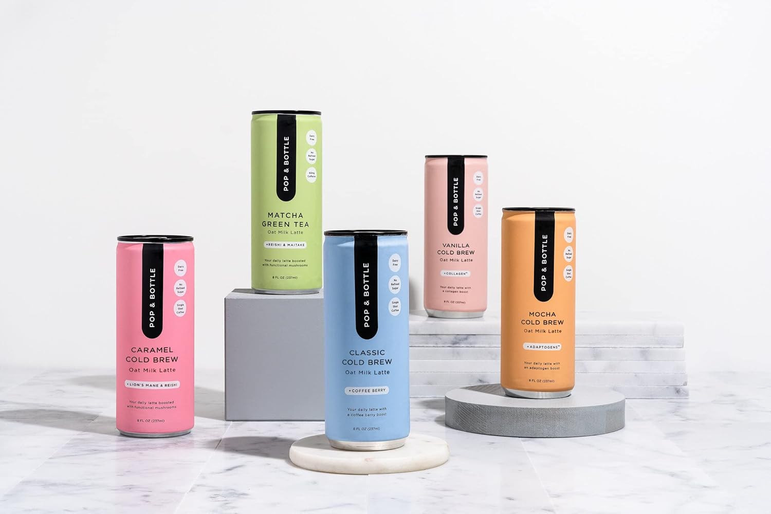 - CANNED COFFEE DRINKS - Pop and Bottle oat milk latte drinks are crafted to help jumpstart your day with organic ingredients & supplements to keep you going while at home or on the go.