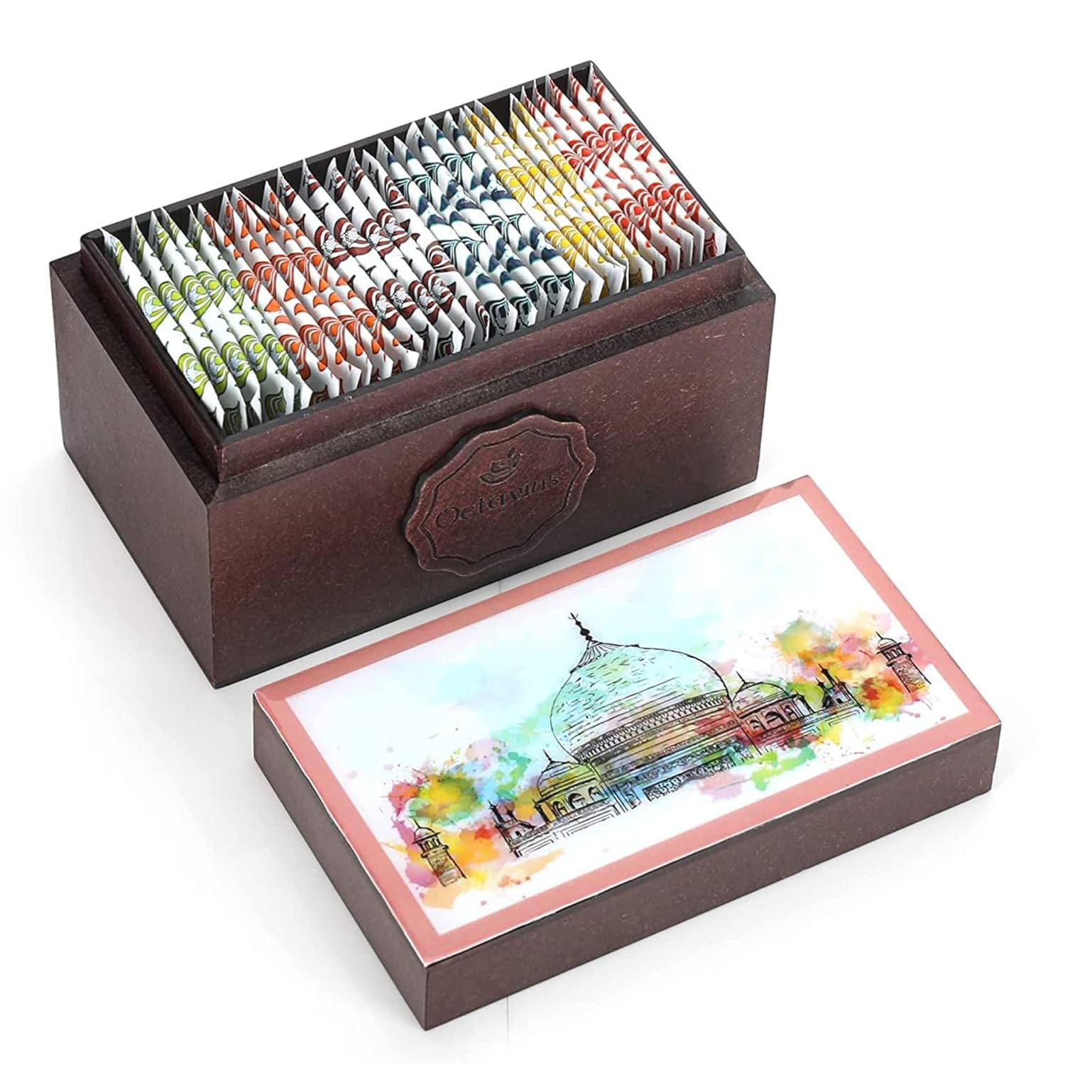 Octavius Assorted Tea Gift Set | 6 Assorted Black & Green Teas | 30 Teabags | Wooden Tea Sampler Pack w/Taj Print Design | Pack of 1