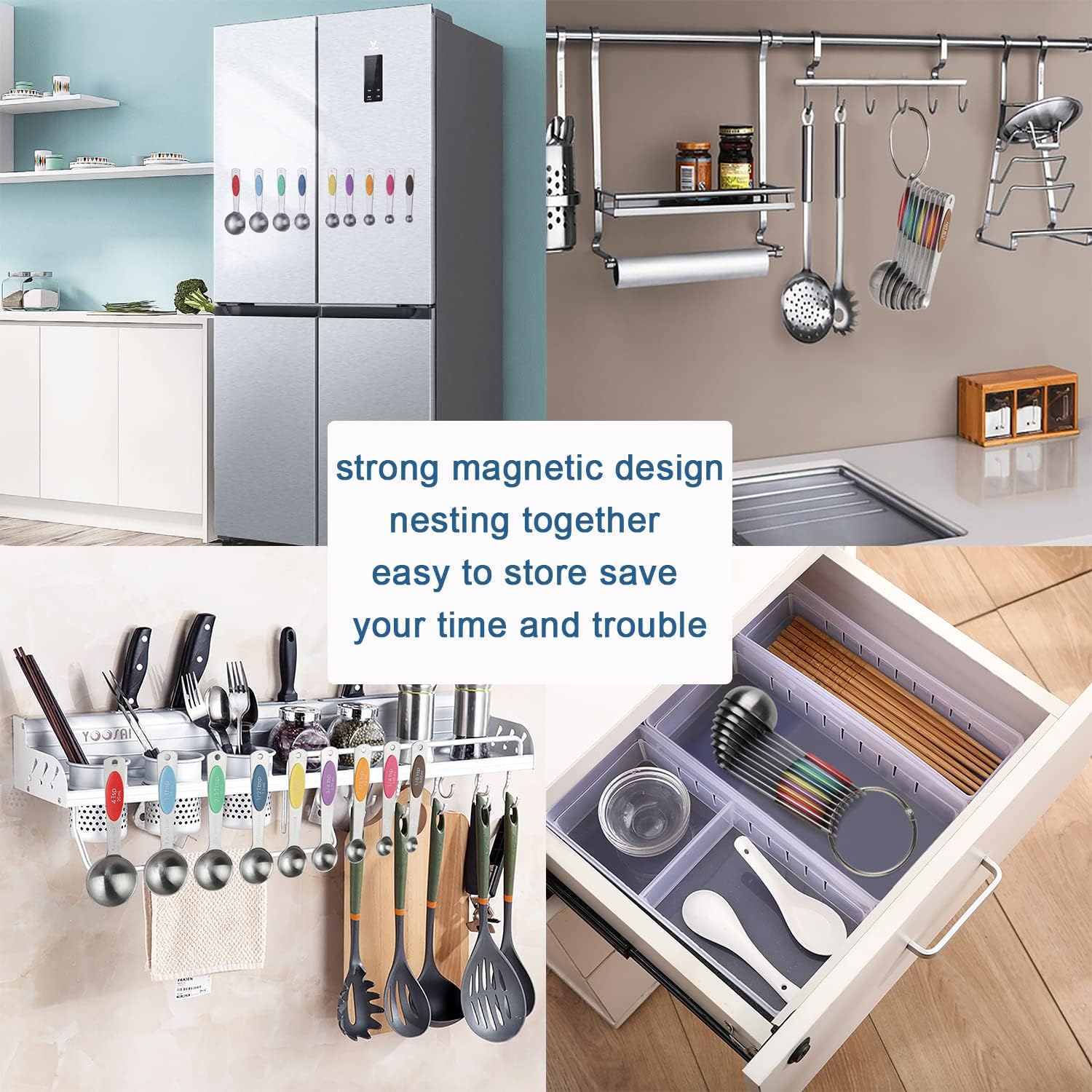 - [Magnetic Design]: Each measuring spoon has magnetic handles keep Spoons together for easy tightly stacks together in the drawer . These measuring spoons store easily and stay together, strong Magnetic do the job to keep these neatly in the drawer.you can quickly grab the measuring spoon you need without.