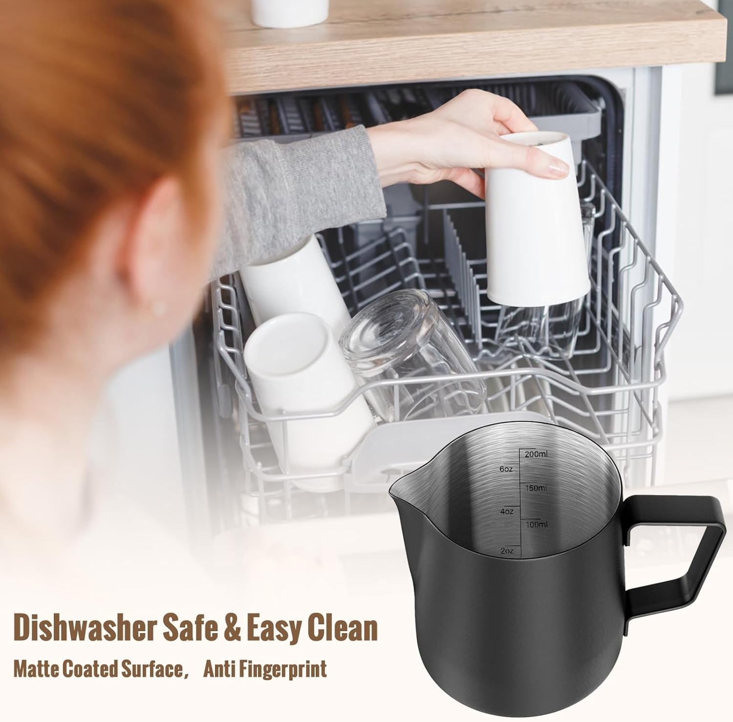 - Material: 18/8 stainless Steel, NO rust, easy to clean & dishwasher safe. You'll be shocked by the high quality. Molded pouring spout and sturdy ergonomic handle means no mess and perfect latte art