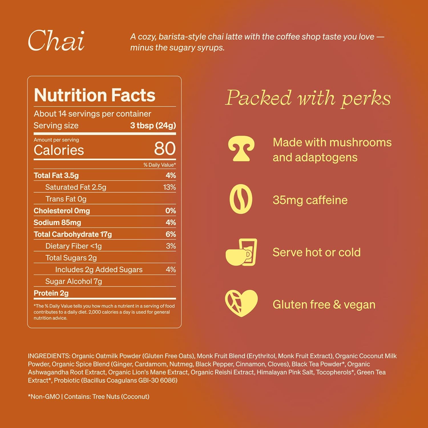- FUNCTIONAL INGREDIENTS: Our chai latte features a science-backed blend of adaptogens, mushrooms and probiotics. Probiotics support gut health while our blend of adaptogens and mushrooms (including Organic Lion’s Mane, Reishi & Ashwagandha) promote energy, a positive attitude, and overall health.