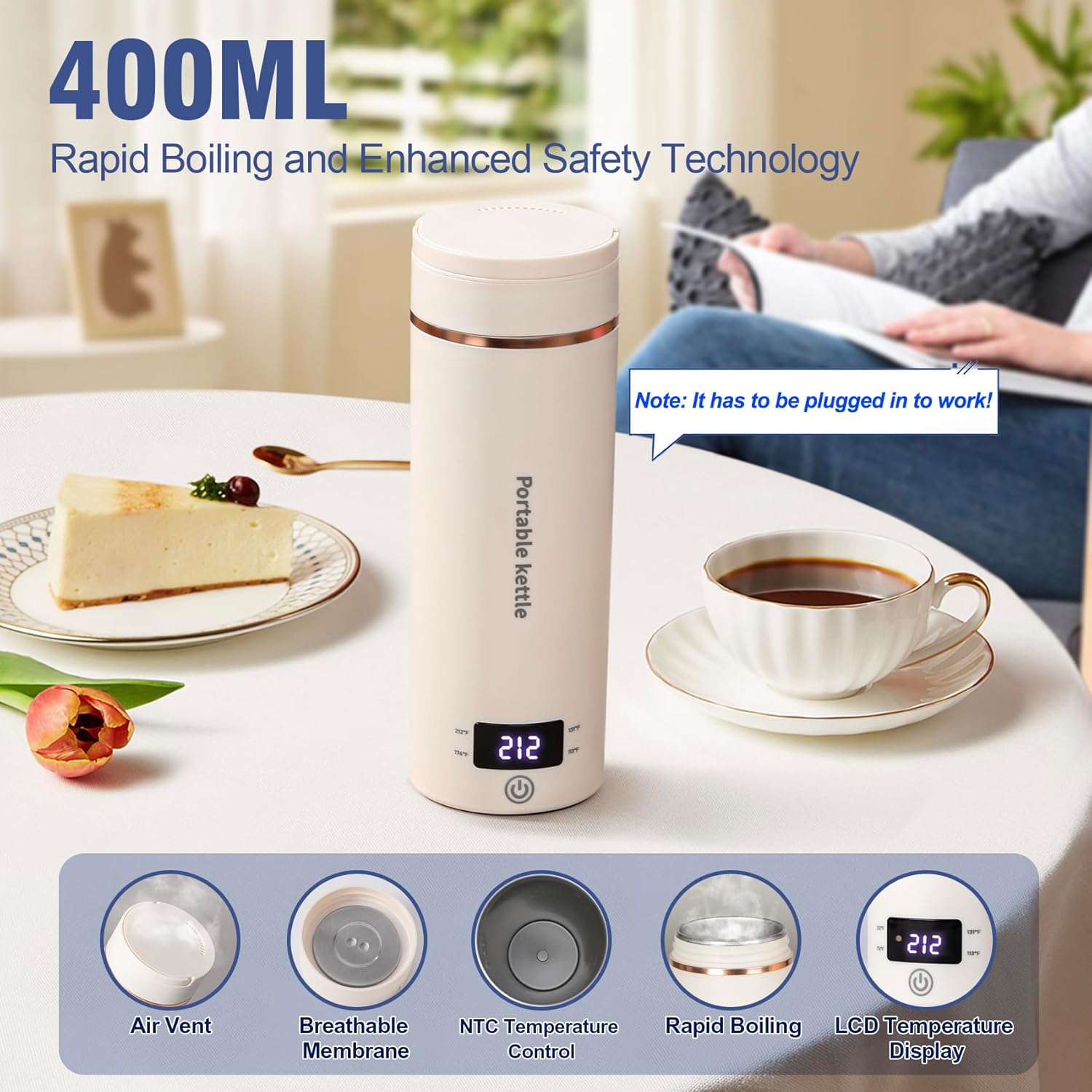 - 4 Smart Temperature Presets: Corded Portable electric kettle has 4 preset temperatures (212-176-131-113°F), through the LCD screen of the cup body to display the temperature easily switched. Small kettle is not only a electric kettle, but also a water cup, can greatly improve the happiness of life. Tip: The Plug-in travel kettle requires plugging into a power source to operate.
