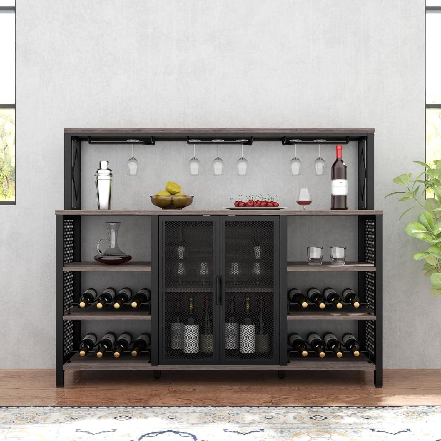Bar Cabinet, 55 Inches Industry Coffee Bar Cabinet with Wine Rack and Glass Holder, Kitchen Sideboard Buffet Cabinet with Wine Rack Storage for Liquor and Glasses (Rustic Grey)