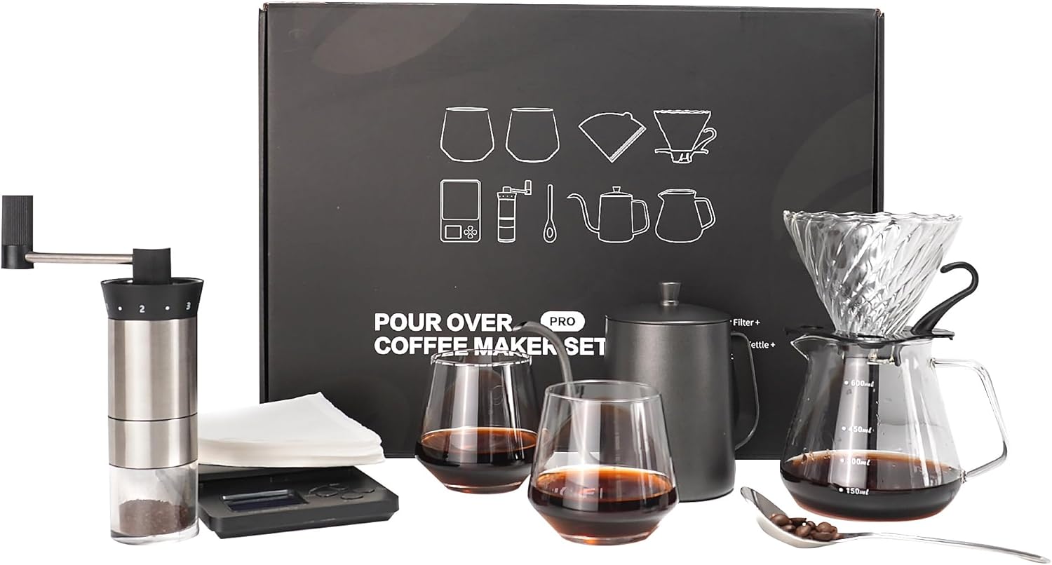 - 🌟 ALL-IN-1 SET: This set comes with 1pc 32oz gooseneck kettle, 1pc glass dripper, 1pc 20oz glass coffee server, 50pcs paper coffee filters, 2pcs 10oz glass coffee cups, 1 pcs coffee spoon, 1pc manual coffee grinder, 1pc coffee scale. This is a professional pour over coffee maker kit that is ideal for professionals.
