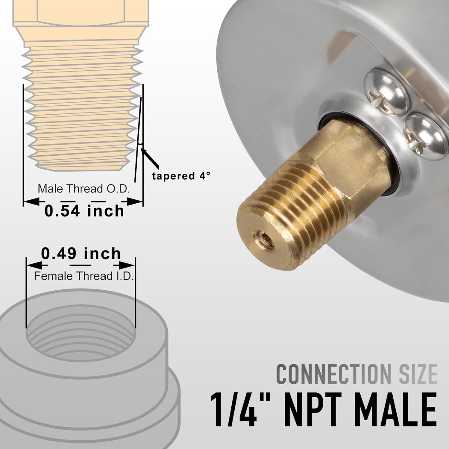 - The connection is a back mount male type with a 1/4" NPT thread, making it easy to set up in various systems.
