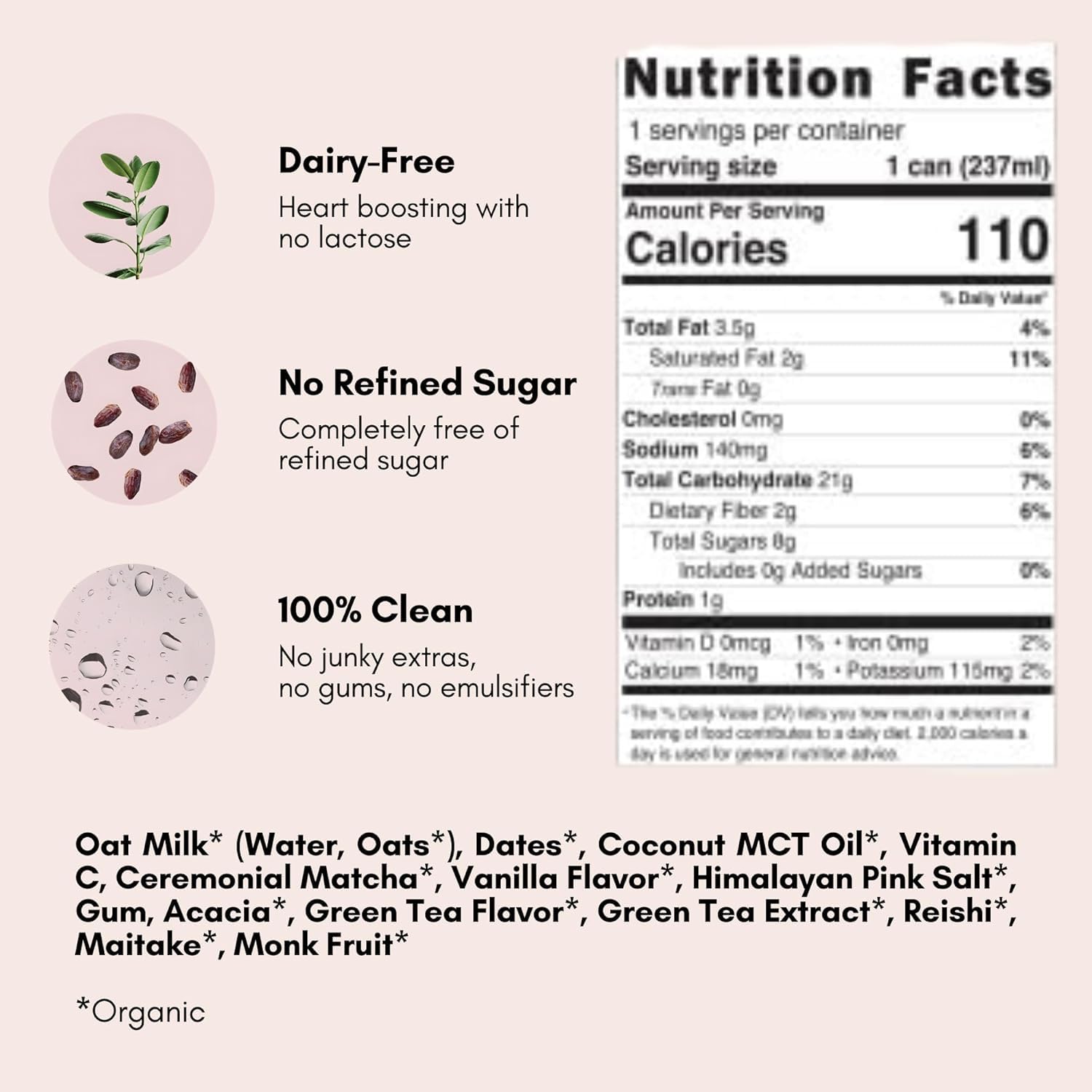 Pop & Bottle, Vanilla and Matcha Oat Milk Lattes - Reishi and Maitake Mushrooms, Green Tea, Cold Brew, Marine Collagen, MCT Oil, Organic, Dairy & Gluten Free, Vegan - 8 Fl Oz, (Pack of 12), 6 Each
