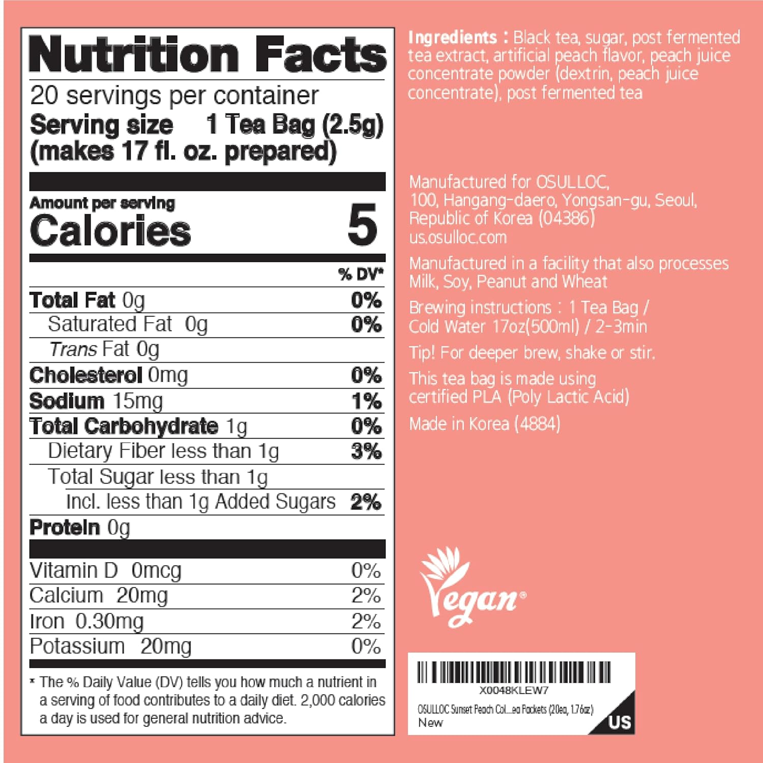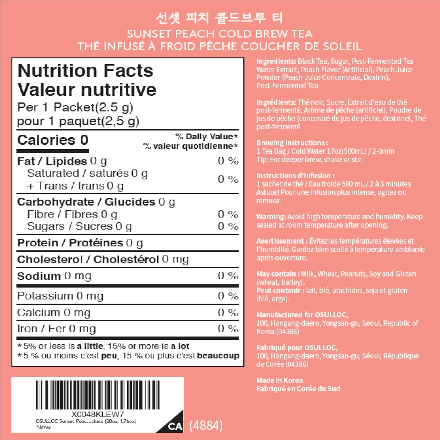 OSULLOC Sunset Peach Cold Brew Tea, Sweet peach flavored iced tea, Hydration Tea Packets (20ea, 1.76oz)