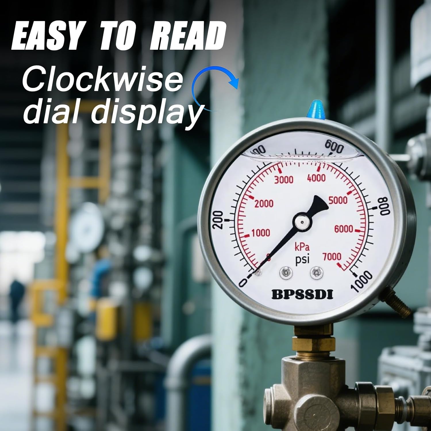 0-1000 Psi Glycerin Liquid Filled Hydraulic Pressure Gauge, 2.5" Dial Size, 1/4" NPT Lower Mount, 304 Stainless Steel Case, for Water Oil Air Gas Pressure Test