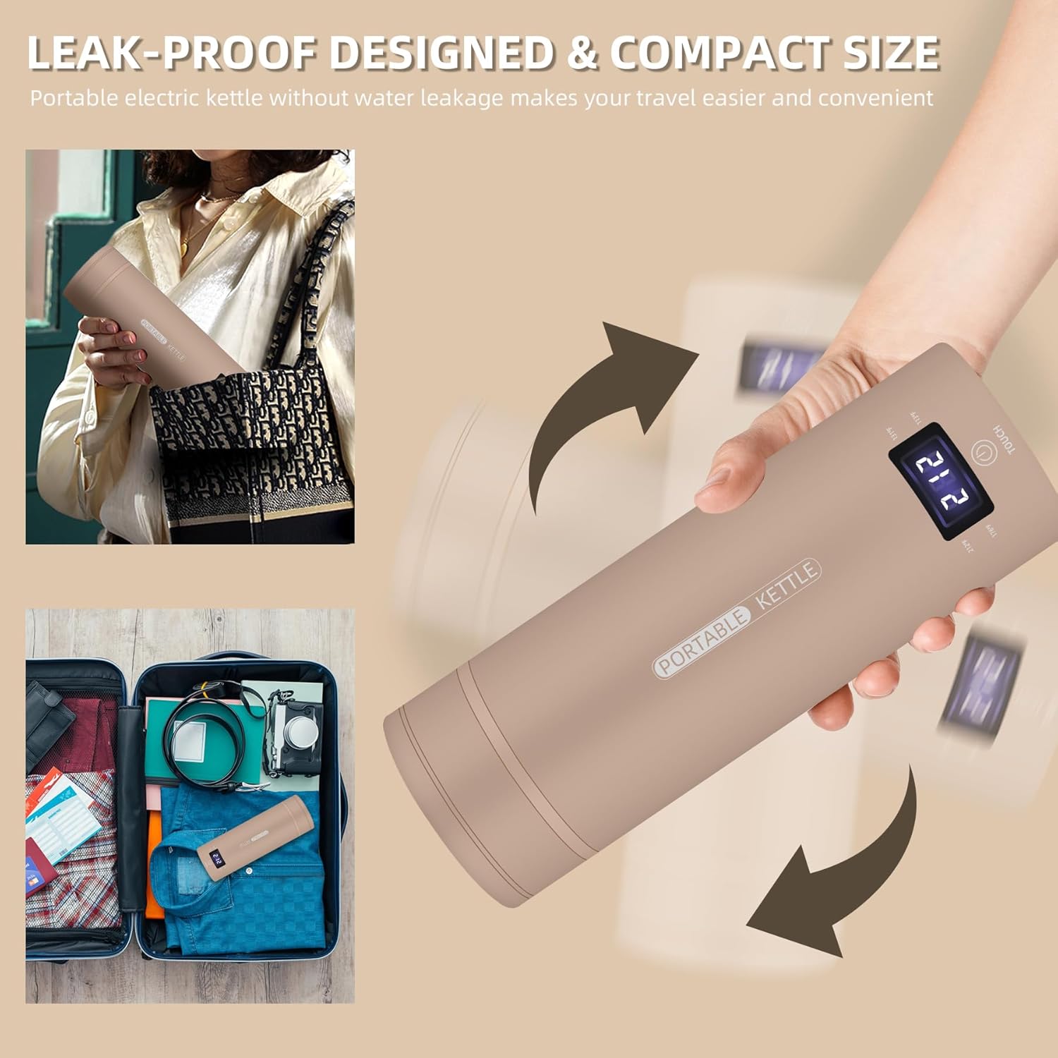 Travel Electric Kettle Portable Small Mini Tea Coffee Kettle Water Boiler, Water Heater with 4 Temperature Control,304 Stainless Steel with Auto Shut-Off & Boil Dry Protection, BPA-Free (Khaki)