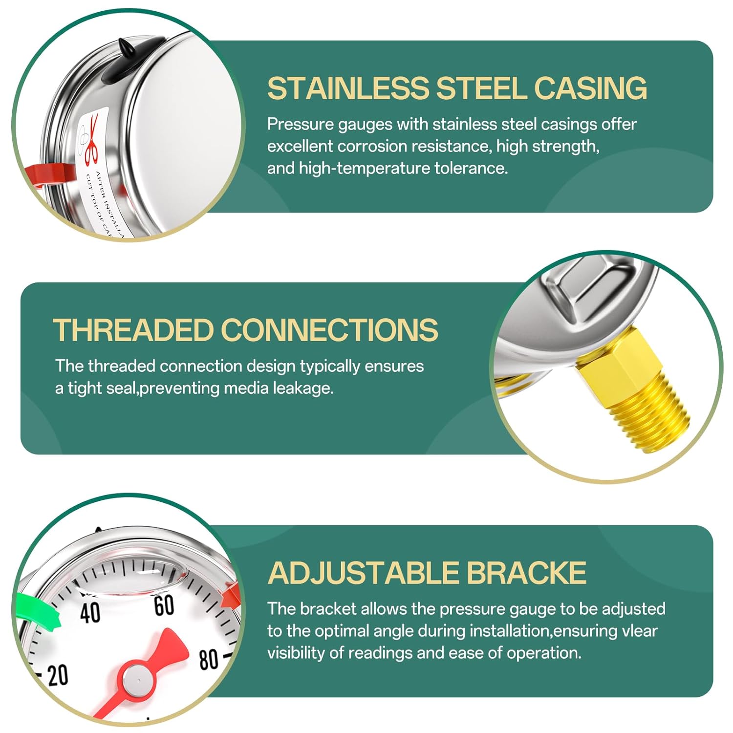- [MATERIAL FEATURES] 304 stainless steel housing, corrosion-resistant, glycerin filled for stable readings and to avoid vibration damag.