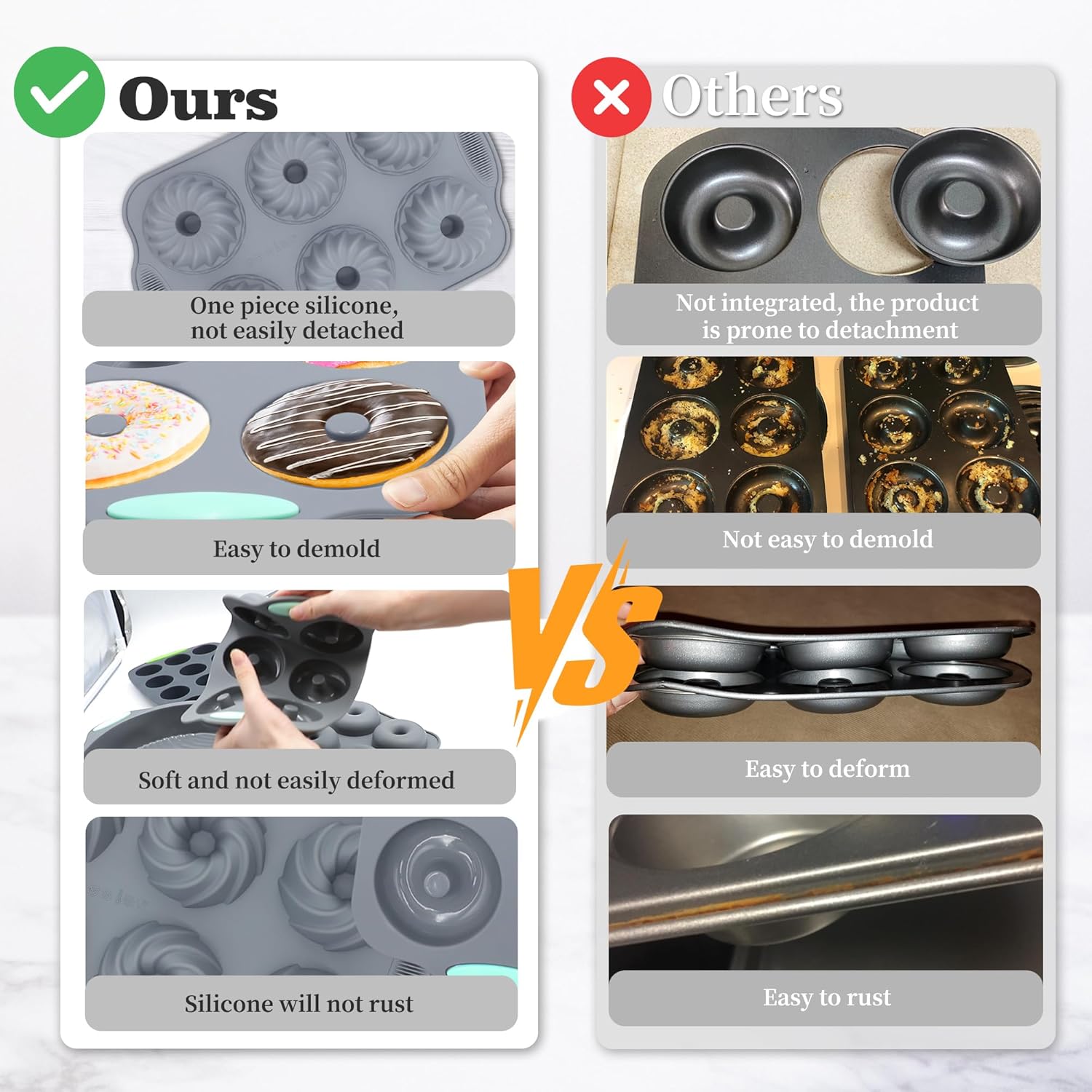 - Easy to Use - After cooling for a few moments, press down on the back of the silicone donut mould and the donuts come out of the oven with ease, making it easy to use for both novice bakers and baking enthusiasts alike.