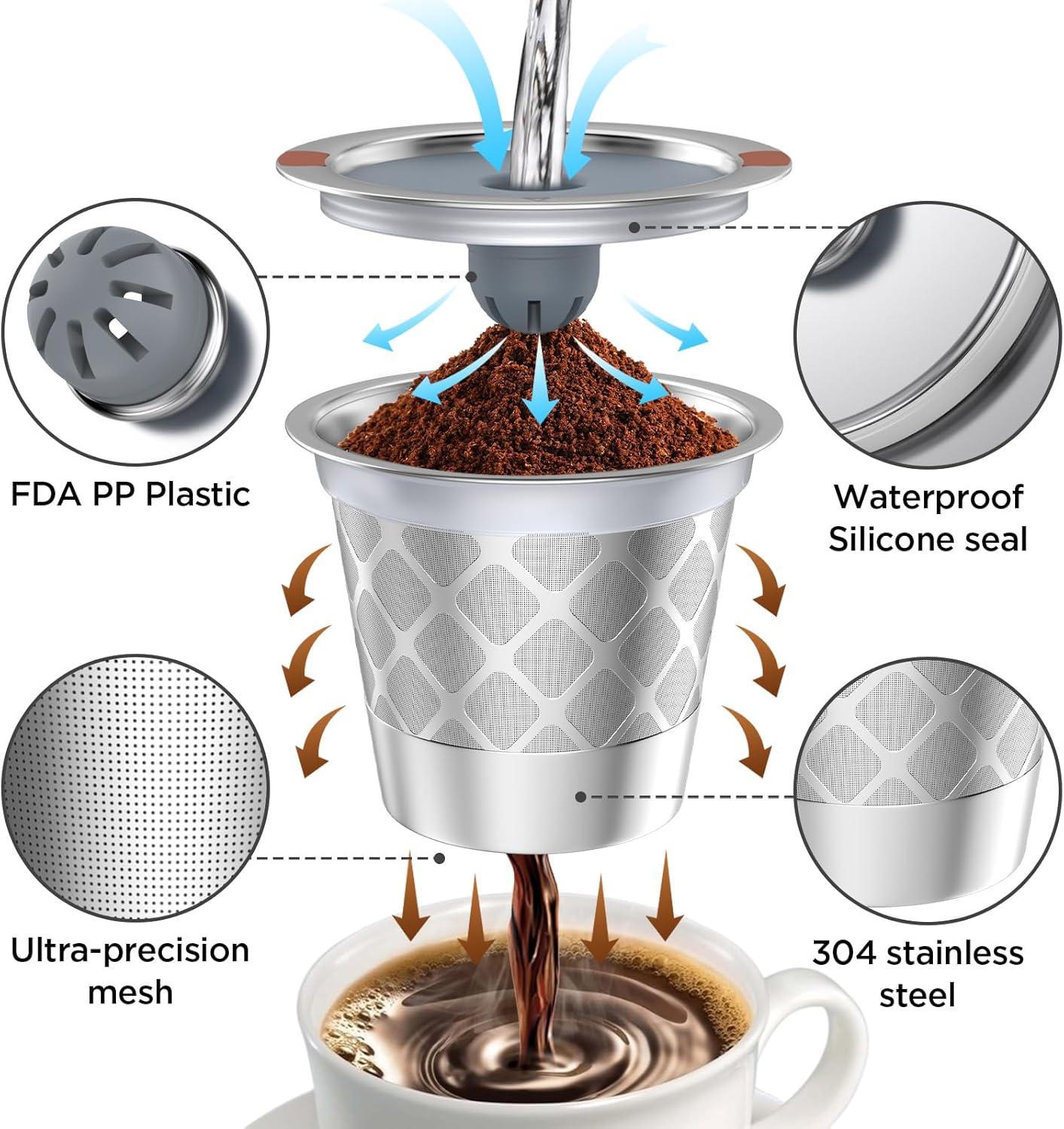 - Keurig reusable coffee pods design science: Coffee reusable k cup adopts one-piece design, tightly sealed top cover to prevent coffee overflow during use; 360-degree perforation on the bottom and side walls allows water to fully soak the coffee powder, optimize coffee extraction, and obtain a richer flavor The flavour ensures that delicious coffee is brewed, and the reusable k-cup filter is very useful for coffee lovers.