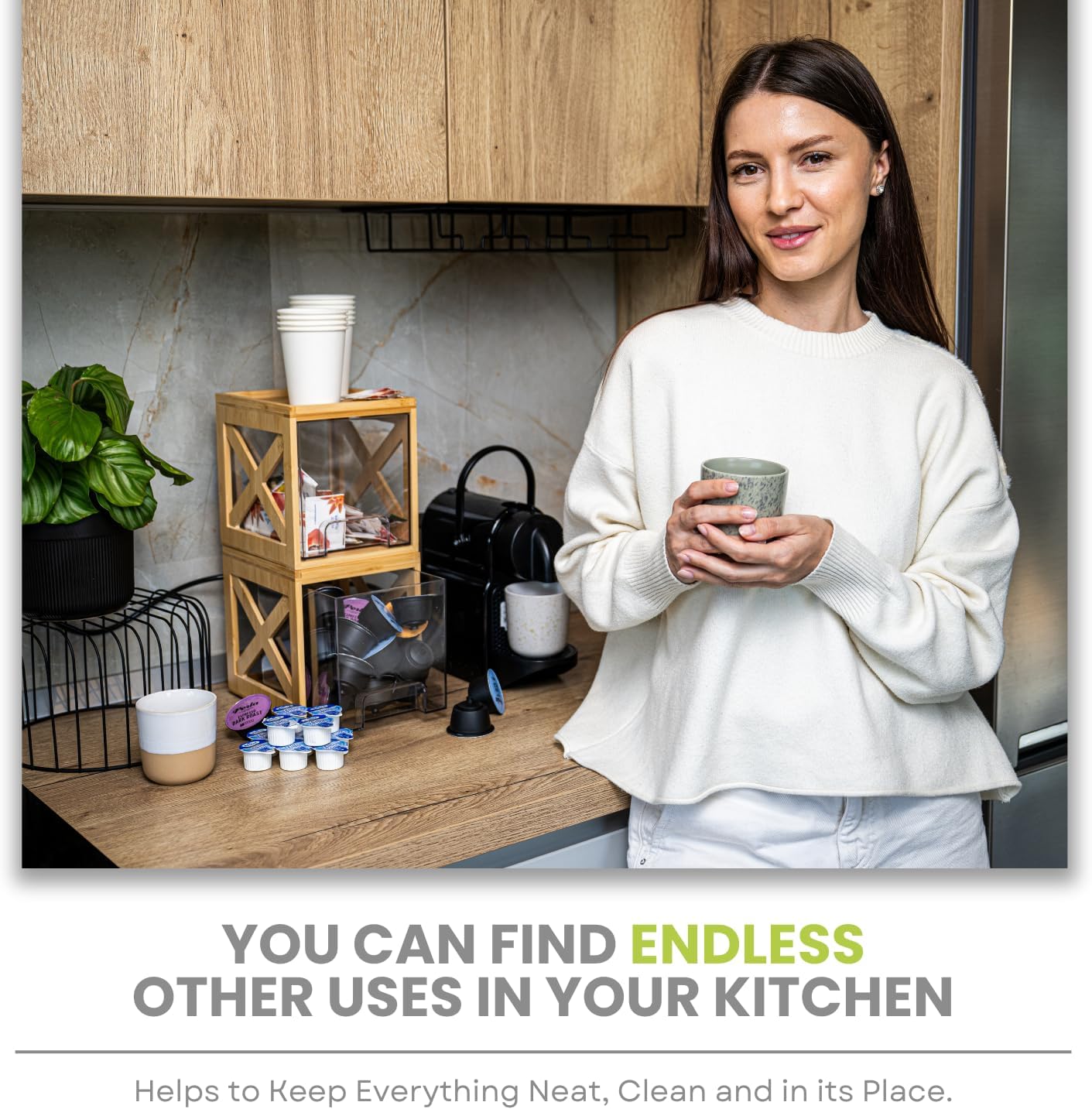 - 4. MULTIPURPOSE STORAGE – FROM K-CUPS TO MAKEUP ORGANIZATION More than just a bamboo coffee pod holder: store spices, vitamins, creamer pods, honey jars, snacks, pastries, food cans. This wooden stackable storage bins solution is perfect for kitchens, cafés, food business or even offices.