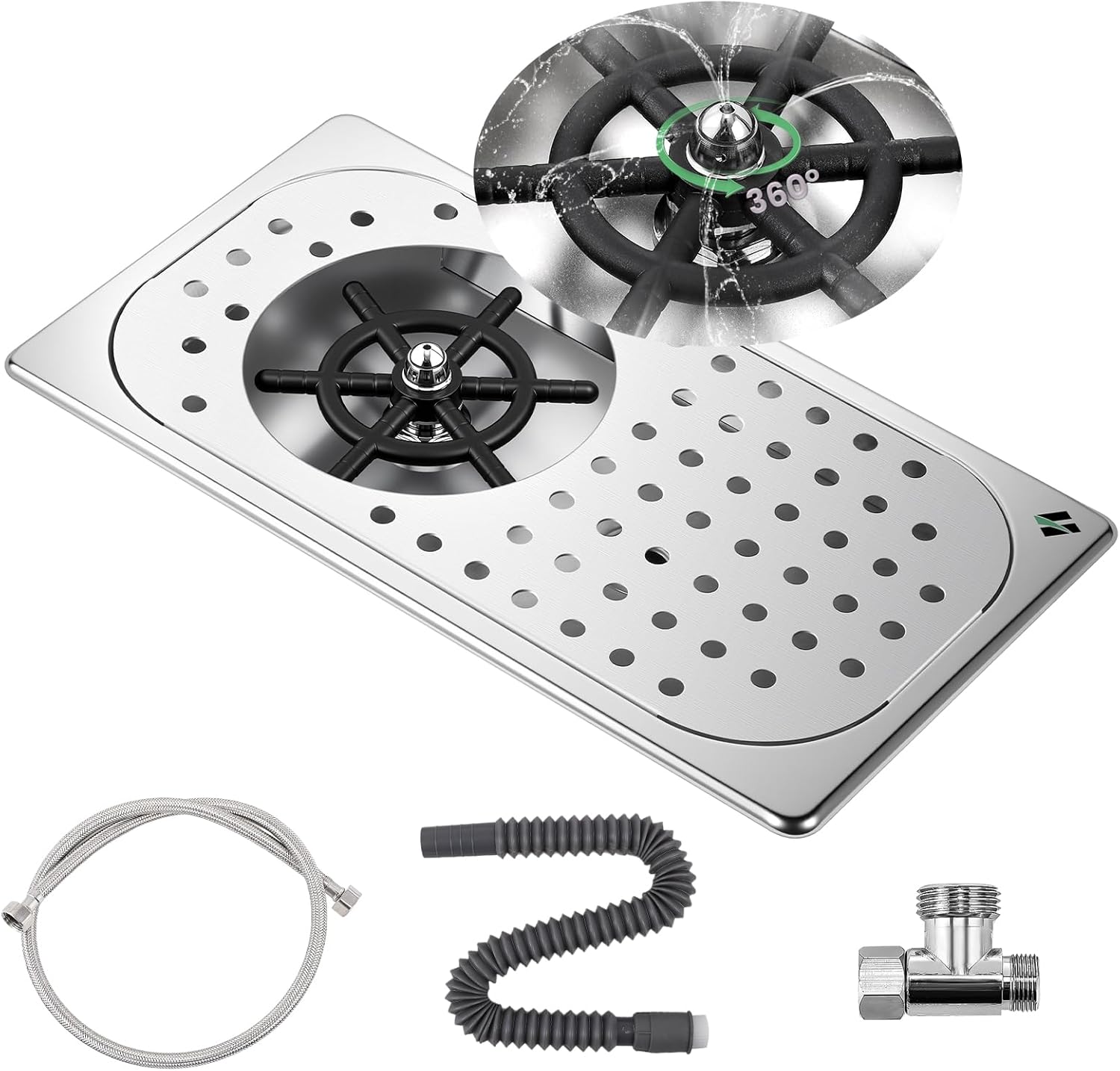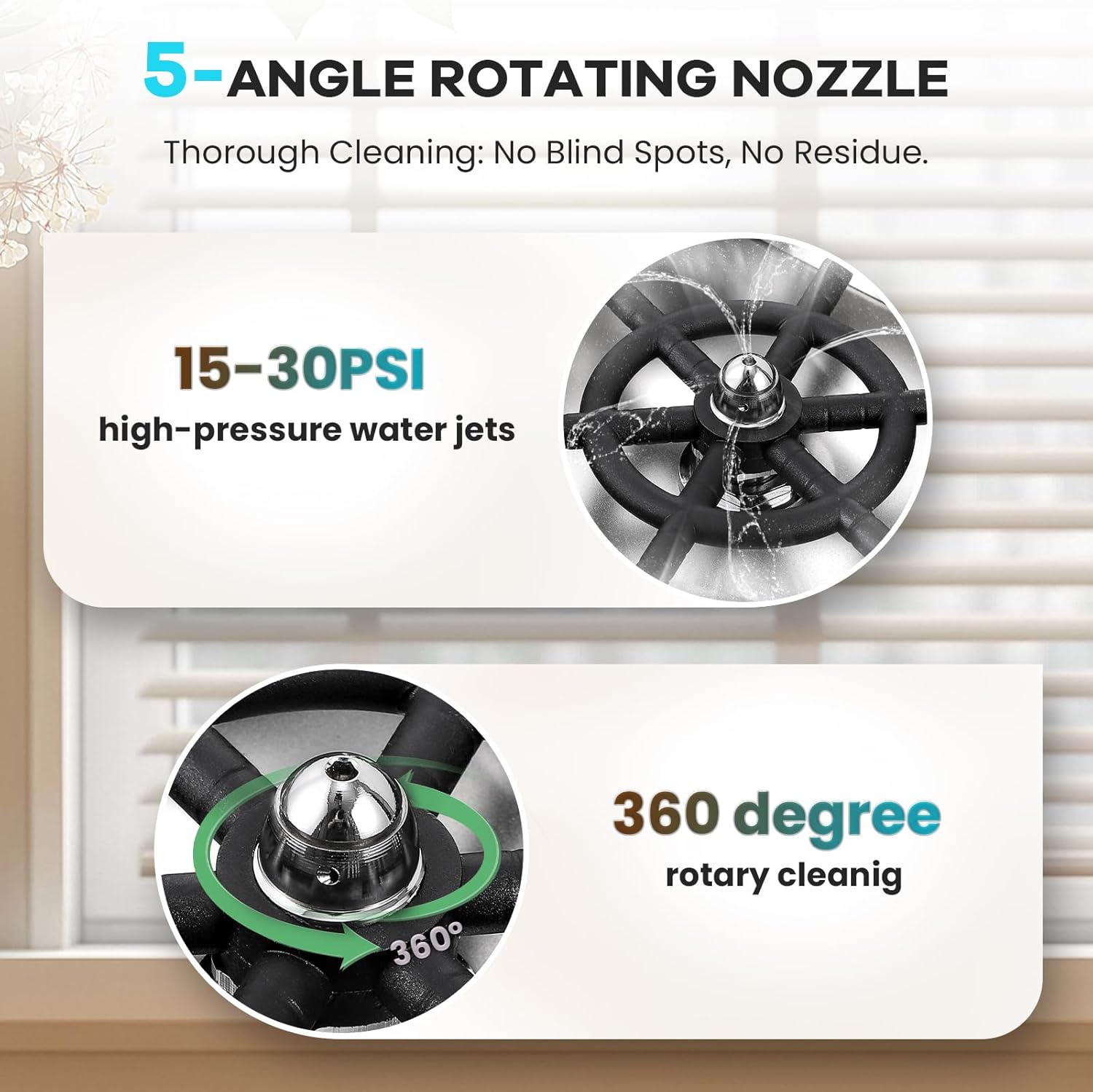 - [5-angle rotating nozzle] The five-hole spray nozzle of the glass rinser rotates 360 degrees, delivering high-pressure water jets for thorough cleaning. No blind spots, no residue—just spotless cups every time