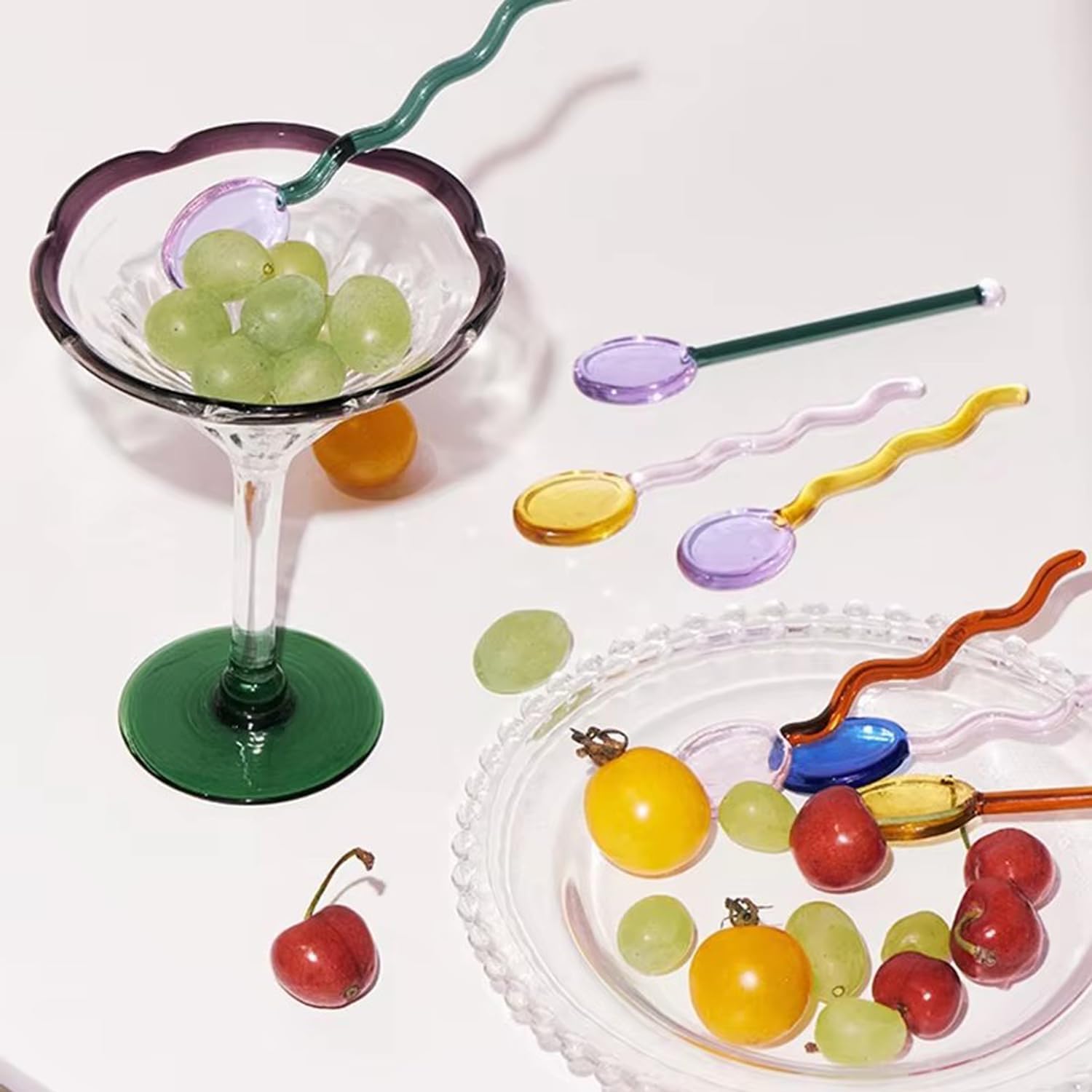 - - [STYLISH DESIGN] Our elegant glass teaspoons feature a curvy handle and come in different colors (green, amber, pink,blue,gold) to match any tableware.