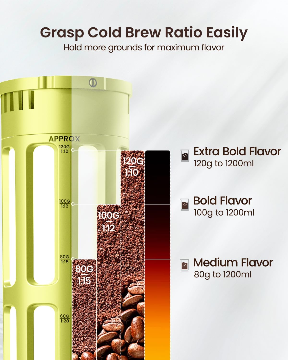 - Grasp Cold Brew Ratio Easily: Experience the art of precision brewing with our cold brew pitcher! When using 120g, 100g, 80g, and 60g of coffee grounds with the same time and water quantity, each ratio creates a distinct coffee concentration. Unlock the potential for customized cold brew strength, allowing you to savor the nuanced flavors according to your preference. Elevate your cold brew experience with our versatile pitcher.