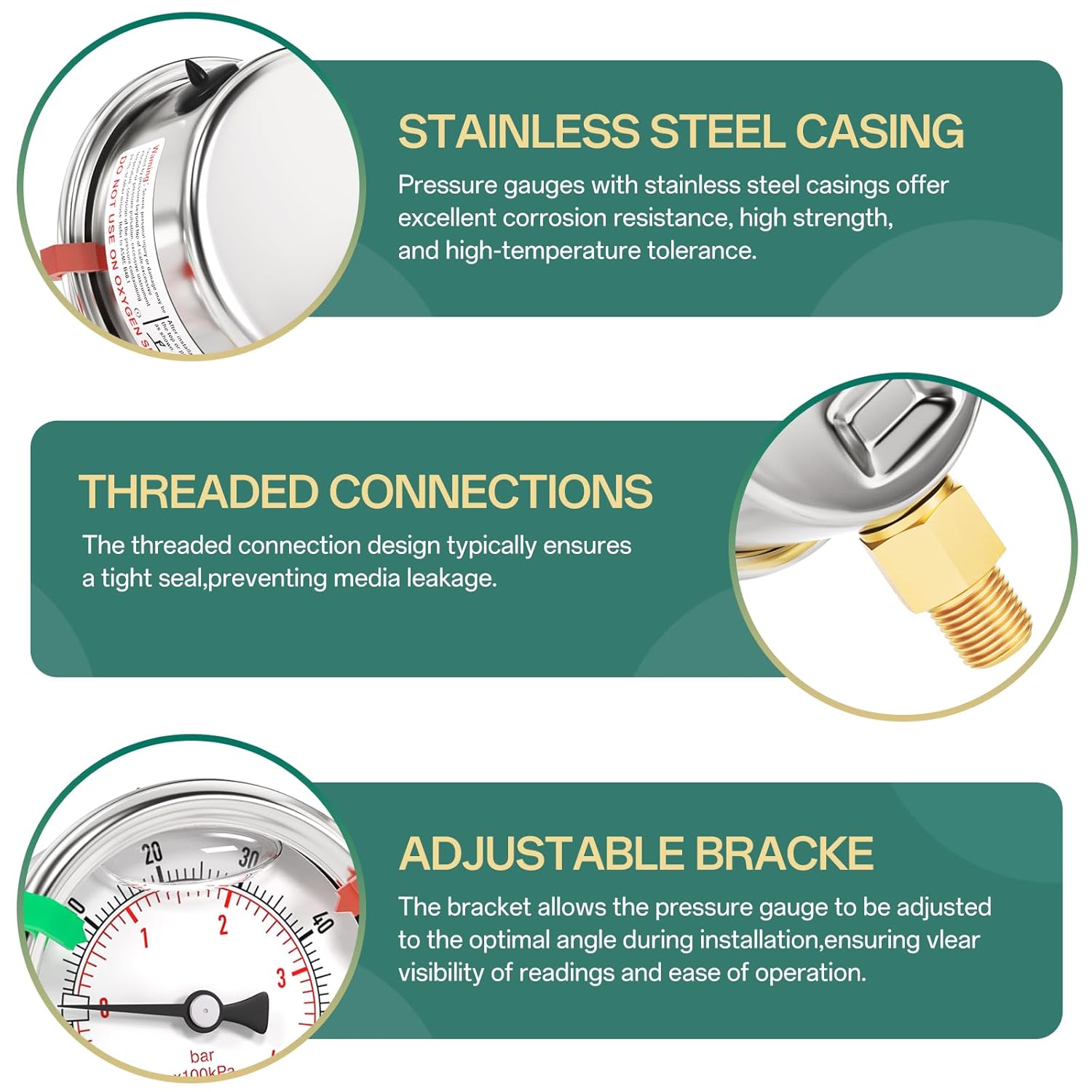 - [SIZE] 2.5" dial size, 1/8" NPT lower mount