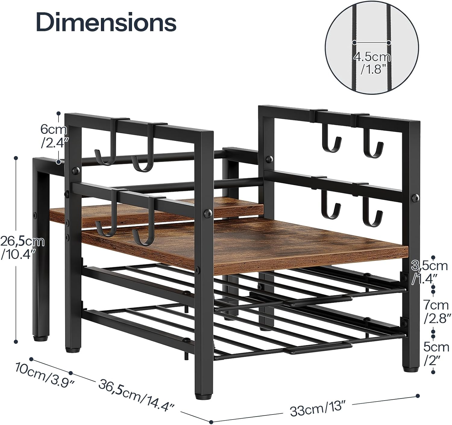 - Coffee Pod Holder with Versatile Storage Rack: The top holds the coffee machine, while the back shelf is ideal for storing syrups and cups, complemented by 2 metal sliding drawers for k cup holder and 8 movable hooks for convenient mug hanging, ensuring optimal space utilization