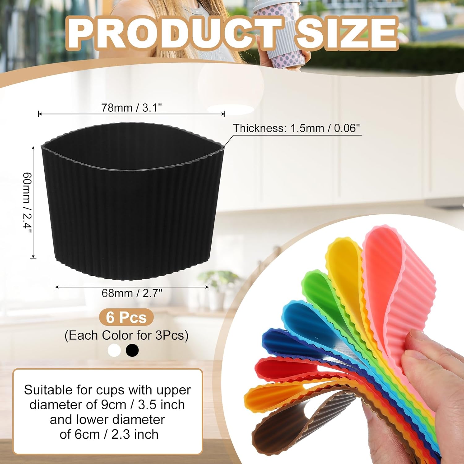 - Specification: Color: White/Black; Material: Silicone; Style: Tapered Stripes; High: 60mm / 2.4 inch; Upper Diameter: 78mm / 3.1 inch; Lower Diameter: 68mm / 2.7 inch; Thickness: 1.5mm / 0.06 inch; Applicable Cup Upper Diameter: 9cm / 3.5 inch; Applicable Cup Lower Diameter: 6cm / 2.4 inch; Package Contents: 6 x Cup Sleeve