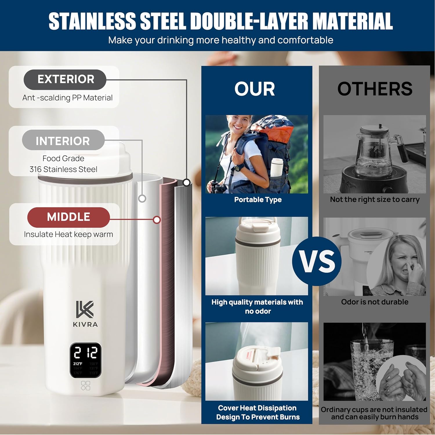 KIVRA Travel Kettle-316 Stainless Steel Portable kettle, 450mL Portable Water Boiler with 6 Temperature Control, Auto Shut Off & Boil Dry Protection, Small Electric Kettle for Global Use (100-240V)