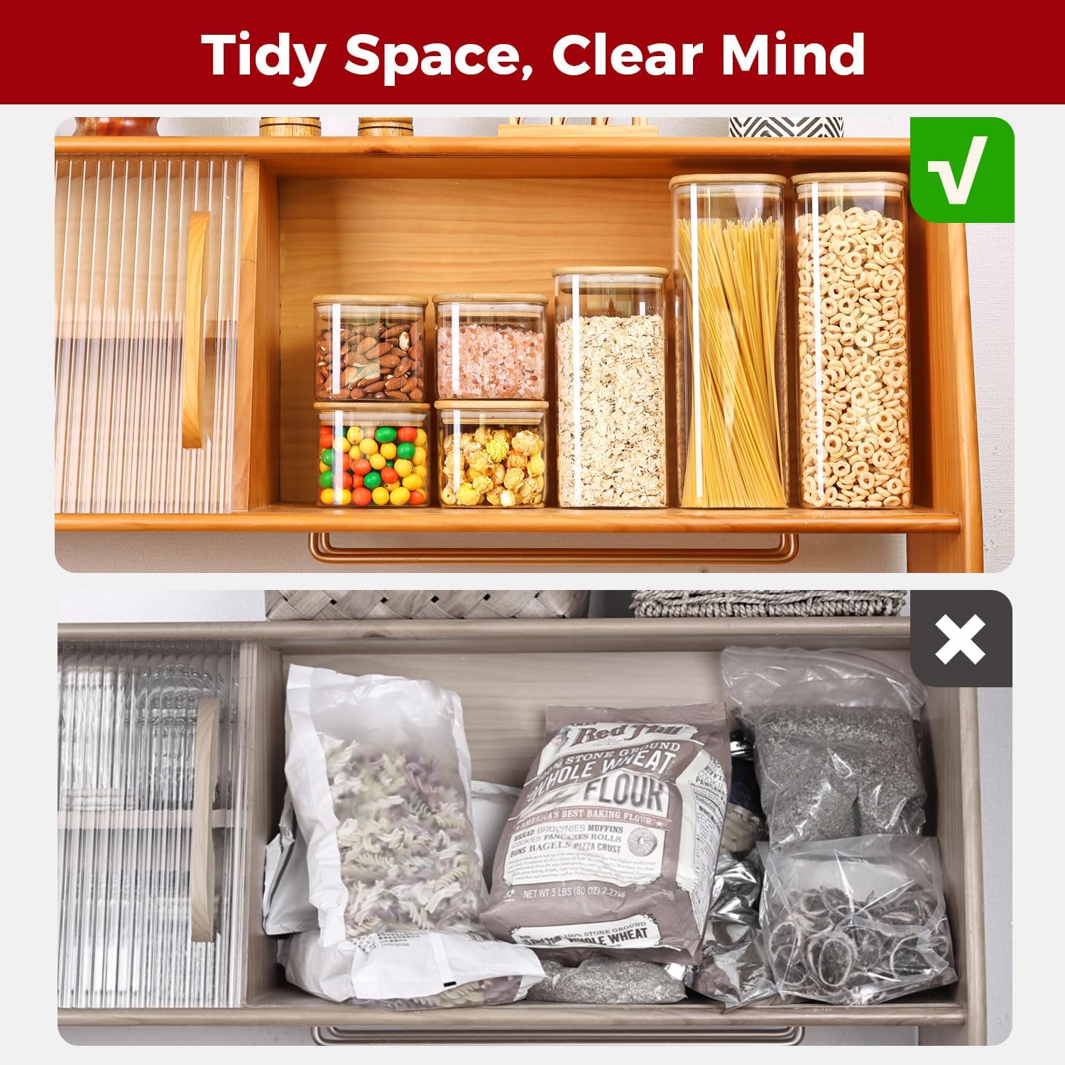 - 【Elegant & Practical Design】Sleek square shape and clear glass offer both style and function—quickly identify contents and keep your countertop or pantry organized with a modern touch.