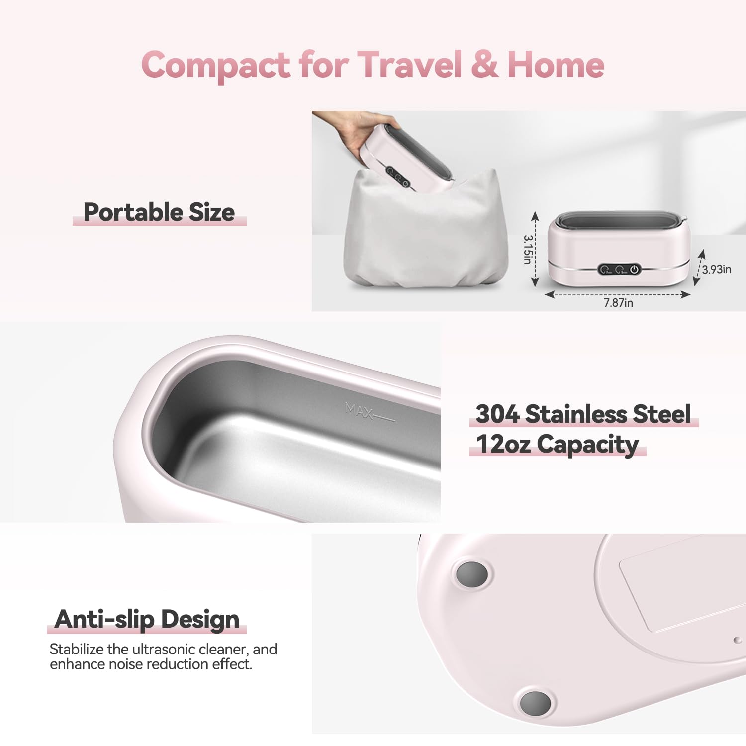Ultrasonic Jewelry Cleaner, Upgraded 48KHz Ultrasonic Cleaner Machine with 304 Stainless Steel for Jewelry, Eyeglasses, Rings, Dentures, Watch Strap(Light Pink)