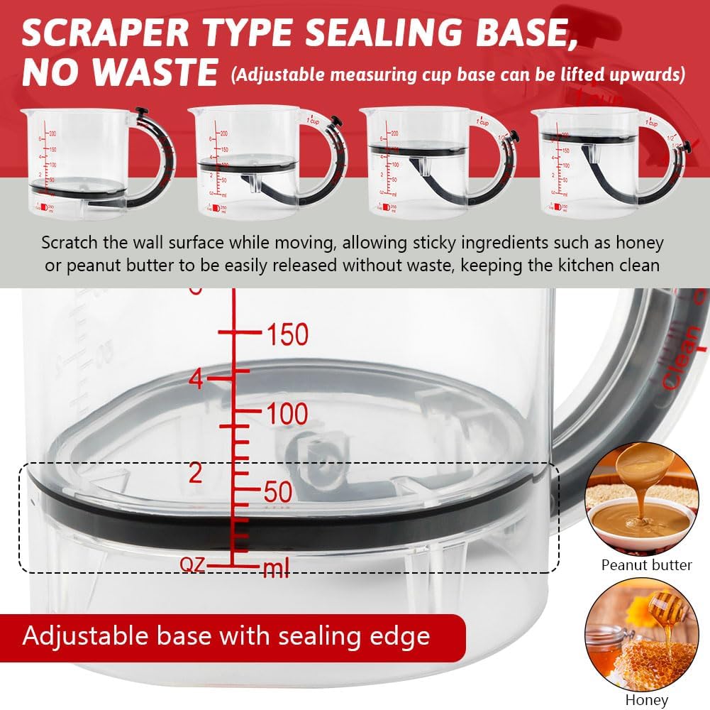 - [Scraper-Style Seal Base for No Waste]: This push-up measuring cup with adjustable base scrapes the walls clean as it moves, making it easy to measure sticky foods like honey, peanut butter, or syrup without waste and leaving a messy residue.